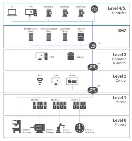 Il modello è organizzato su 5 livelli differenti: si parte dai livelli più bassi, dove sono presenti i sensori, gli attuatori e i sistemi di controllo, fino ad arrivare ai livelli più alti contenenti l’infrastruttura di convergenza tra gli ambienti IT e OT.
